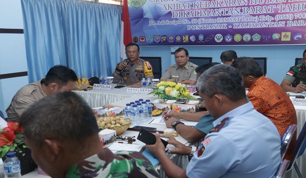 Dijelaskan, dalam upaya penanganan ini dilakukanlah Rapat Evaluasi Penanganan Bencana Asap di Pos PDB Provinsi Kalbar. Kepala Kepolisian Daerah Kalimantan Barat, Inspektur Jenderal Polisi Drs Didi Haryono SH MH yang turut hadir dalam rapat ini juga menyampaikan bahwa kepolisian sudah melaksanakan langkah- langkah teknis dan strategis.